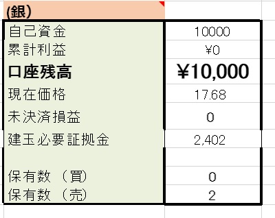 201704/25 4/25 【新規】17.68 売 10 【新規】 0 4/25 【新規】17.68 売 10 【自己資金】 10,000円(マネパnano口座から借) 【累計利益】 円 【口座残高】10,000円 【証拠金】 2100円 【未決済損益】 円 【保有数】 2(20) [0回]