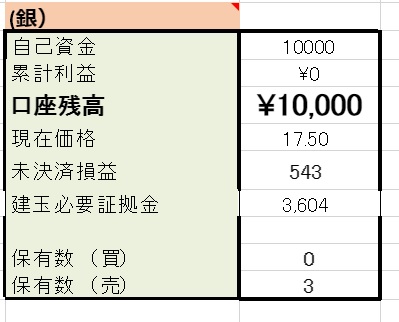 201704/26 4/26 【新規】17.50 売 10 【新規】 0 4/26 【新規】17.50 売 10 【自己資金】 10,000円(マネパnano口座から借) 【累計利益】 円 【口座残高】10,000円 【証拠金】 3604円 【未決済損益】 +543円 【保有数】 3(30) [0回]