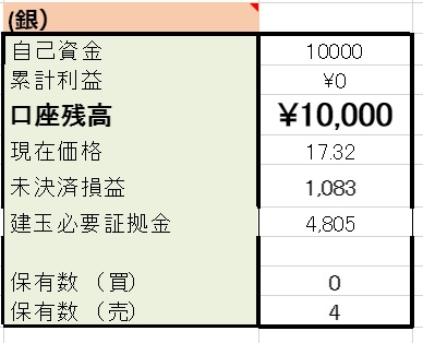 201704/23 4/21 【新規】売 1単位 【新規】 0 4/21 17.86 売 10 【自己資金】 10,000円(マネパnano口座から借) 【累計利益】 円 【口座残高】10,000円 【証拠金】 1050円 【未決済損益】 円 【保有数】 1(10) [0回]